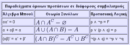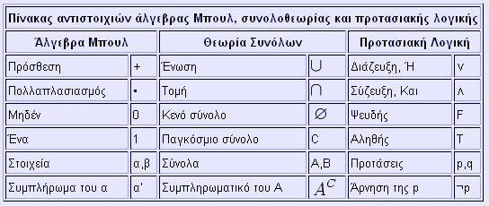Άλγεβρα Μπουλ (Boolean Algebra) Ιστορικά στοιχεία Ο μαθηματικός Τζορτζ Μπουλ (George Boole, 1815-1864) παρουσίασε το 1847 μια άλγεβρα με μεταβλητές δύο τιμών (που καλούνται "λογικές μεταβλητές"). Ουσιαστικά παρουσίασε με τα μαθηματικά της εποχής του την Αριστοτέλεια λογική του είναι ή δεν είναι. Σήμερα η άλγεβρα αυτή ονομάζεται άλγεβρα Μπουλ, ή δυαδική άλγεβρα, ή διακοπτική άλγεβρα και έχει βρει ευρεία εφαρμογή στην σχεδίαση του λογισμικού και των κυκλωμάτων των ηλεκτρονικών υπολογιστών, επειδή είναι ιδανική για χειρισμό λογικών συναρτήσεων και πράξεων στο δυαδικό σύστημα. Ο παρακάτω ορισμός της άλγεβρας Μπουλ στηρίζεται σε συγκεκριμένα αξιώματα που παρουσίασε το 1933 ο μαθηματικός Έντουαρντ Χάντινγκτον (Edward Vermilye Huntington, 1874-1952). Αξιώματα του Χάντινγκτον * Αξίωμα Α1: Ισοδυναμία Υπάρχει ένα σύνολο Κ με αντικείμενα ή στοιχεία, που υπακούουν σε μια σχέση ισοδυναμίας, α = β (όπου το σύμβολο ‘=’ διαβάζεται είναι ίσο με), που ικανοποιεί την αρχή της αντικατάστασης. Αν το στοιχείο α ανήκει στο σύνολο Κ, γράφουμε [α * Αξίωμα Α2.1: Πράξη πρόσθεσης Ένας κλειστός νόμος (σύμβολο ‘+’ διαβάζεται συν), που θα τον λέμε πρόσθεση, ορίζεται έτσι, ώστε αν α * Αξίωμα Α2.2: Πράξη πολλαπλασιασμού Ένας κλειστός νόμος (σύμβολο ‘•’ διαβάζεται επί), που θα τον λέμε πολλαπλασιασμό ορίζεται έτσι, ώστε αν α * Αξίωμα Α3.1: Ουδέτερο στοιχείο πρόσθεσης Υπάρχει μόνο ένα στοιχείο 0 * Αξίωμα Α3.2: Ουδέτερο στοιχείο πολλαπλασιασμού Υπάρχει μόνο ένα στοιχείο 1 * Αξίωμα Α4.1: Αντιμετάθεση προσθετέων Η πρόσθεση είναι αντιμεταθετική, δηλαδή (α + β) = (β + α). * Αξίωμα Α4.2: Αντιμετάθεση παραγόντων Ο πολλαπλασιασμός είναι αντιμεταθετικός, δηλαδή (α • β) = (β • α). * Αξίωμα Α5.1: Επιμεριστική πρόσθεση Η πρόσθεση είναι επιμεριστική επί του πολλαπλασιασμού, δηλαδή α + (β • γ) = (α + β) • (α + γ). Αυτό είναι ένα αξίωμα της άλγεβρας Μπουλ που δεν ισχύει στην άλγεβρα των πραγματικών αριθμών! * Αξίωμα Α5.2: Επιμεριστικός πολλαπλασιασμός Ο πολλαπλασιασμός είναι επιμεριστικός επί της πρόσθεσης, δηλαδή α • (β + γ) = (α • β) + (α • γ). (Σημείωση : Όταν δεν υπάρχει περίπτωση παρανόησης, παραλείπουμε την αναγραφή του επί ‘•’ και χρησιμοποιούμε απλή παράθεση των παραγόντων. Για παράδειγμα, η σχέση εδώ μπορεί να γραφτεί έτσι : α (β + γ) = α β + α γ) . * Αξίωμα Α6: Συμπληρώματα Για κάθε στοιχείο α * Αξίωμα Α7: Διάκριτα στοιχεία Υπάρχουν τουλάχιστον δυο στοιχεία α και β μέσα στο Κ που δεν είναι ισοδύναμα. Ανάλογα με το πλήθος και το είδος των στοιχείων του Κ, καθορίζεται και μια άλγεβρα. Η απλούστερη άλγεβρα Μπουλ έχει μόνο δυο στοιχεία, δηλαδή το Κ = {0, 1}. Για τα στοιχεία αυτά ισχύουν τα εξής : 1' = 0 και 0' = 1, 0 + 0 = 0 και 1 • 1 = 1, 0 + 1 = 1 και 1 • 0 = 0, 1 + 0 = 1 και 0 • 1 = 0, 1 + 1 = 1 και 0 • 0 = 0 (Α7). Αρχή του δυϊσμού Αν σε μια λογική έκφραση αντικατασταθούν το (συν +) με (επί •) και το (επί •) με (συν +) και το (μηδέν 0) με (ένα 1) και το (ένα 1) με (μηδέν 0) δημιουργείται η δυϊκή έκφραση, που ισχύει όπως και η αρχική. Η αρχή του δυϊσμού εμφανίζεται και στα αξιώματα του Χάντινγκτον, που δίνονται κατά ζεύγη. Άλγεβρα Μπουλ και θεωρία συνόλων (set theory) Θα μπορούσαμε δούμε την θεωρία συνόλων (τις πράξεις με σύνολα) ως μια άλγεβρα Μπουλ. Ας δούμε τις αντιστοιχίες: * Τα ονόματα στοιχείων του Κ στην θεωρία συνόλων είναι ονόματα συνόλων. * Η πράξη πρόσθεση αντιστοιχεί στην ένωση συνόλων. * Η πράξη πολλαπλασιασμός αντιστοιχεί στην τομή συνόλων. * Το στοιχείο μηδέν αντιστοιχεί στο κενό σύνολο. * Το στοιχείο ένα αντιστοιχεί σ