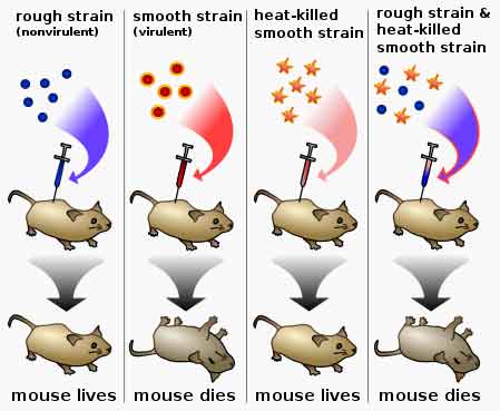 Σχηματική απεικόνιση του πειράματος του Γκρίφιθ (*) Κύριο άρθρο: Πείραμα του Γκρίφιθ Το πείραμα για το οποίο είναι κυρίως γνωστός ο Γκρίφιθ πραγματοποιήθηκε στα πλαίσα των προσπαθειών του να παρασκευάσει εμβολιο για την πρόληψη της πνευμονίας εξαιτίας της πανδημίας γρίπης που υπήρξε μετά τον Πρώτο παγκόσμιο Πόλεμο, και είναι γνωστή σαν «ισπανική γρίπη». Ο Γκρίφιθ χρησιμοποίησε δύο στελέχη βακτηρίων, με τα οποία μόλυνε πόντίκια. Αν και κανένα από τα δύο στελέχη δεν είχε τη δυνατότητα να σκοτώσει τα πειραματόζωα, η ανάμειξη τους από τον επιστήμονα οδήγησε στο θάνατό τους. Συμπέρανε λοιπόν ότι το ένα στέλεχος βακτηρίου μεταμορφώθηκε σε άλλο θανατηφόρο είδος, κάτι που ονόμασε «αρχή μεταμόρφωσης». Το τέλος και η σημασία του έργου του Ο Γκρίφιθ σκοτώθηκε το 1941, ενώ εργαζόταν στο εργαστήριο του στο Λονδίνο μαζί με το φίλο του, βακτηριολόγο Ουίλιαμ Μ. Σκοτ, κατά το βομβαρδισμό του Λονδίνου από τα ναζιστικά αεροπλάνα. Τρία χρόνια μετά το θάνατό του το 1944, ο Όσβαλντ Άβερι μαζί με τους Κόλιν Μακλόιντ και Μακλίν Μακάρτι εξακρίβωσε ότι η «αρχή μεταμόρφωσης» που είχε ανακαλύψει ο Γκρίφιθ ήταν το DNA.[3] Ο ανιψιός του Γκρίφιθ, Τζων Στάνλεϊ Γκρίφιθ, έχει βραβευθεί με το Μετάλλιο Φάραντεϊ της Βασιλικής Εταιρείας. Παραπομπές 1. ↑ Lorenz MG, Wackernagel W (1994). "Bacterial gene transfer by natural genetic transformation in the environment". Microbiol. Rev. 58 (3): 563–602. Εξωτερικοί σύνδεσμοι