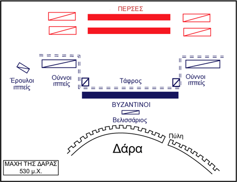 Η μάχη της Δάρας διεξήχθη ανάμεσα στους Σασσανίδες Πέρσες και τη Βυζαντινή αυτοκρατορία στα 530, και ανήκει στις μάχες του Ιβηρικού πολέμου. Η Βυζαντινή αυτοκρατορία βρισκόταν σε πόλεμο με τους Σασσανίδες από το 527, με αφορμή την απόπειρα του Κοβάδ Α΄ βασιλιά της Περσίας να προσηλυτίσει τους Ίβηρες του Καυκάσου στο Ζωροαστρισμό. Ο Κοβάδ προσπάθησε να κλείσει ειρήνη με τους Βυζαντινούς και επιχείρησε να πείσει τον Ιουστινιανό Α΄ να υιοθετήσει το γιο του Χοσρόη. Ο Ιουστινιανός αρνήθηκε και έστειλε τους στρατηγούς Σίττα και Βελισάριο εναντίον της Περσίας, όπου αρχικά ηττήθηκαν. Ο Ιουστινιανός προσπάθησε να διαπραγματευτεί μα ο Κοβάδ αρνήθηκε και έστειλε 30.000 στρατιώτες στη Δάρα της Συρίας το 529. Ο Βελισάριος επέστρεψε στην περιοχή μαζί με τον Ερμογένη και 25.000 άνδρες στα 530 και ο Κοβάδ απάντησε στην κίνηση αυτή, στέλνοντας κι άλλους 10.000 υπό το στρατηγό Φιρούζ, που στρατοπέδευσε σε απόσταση πέντε χιλιομέτρων. Αν και αριθμητικά υστερούσε κατά πολύ, ο Βελισάριος αποφάσισε να επιτεθεί στους ελαφρά οπλισμένους Πέρσες. Έσκαψε έναν αριθμό από χαρακώματα για να ανακόψει το Περσικό ιππικό και παρέταξε το πεζικό του σε ένα ενιαίο σώμα στο κέντρο. Στις πτέρυγες δεξιά κι αριστερά παρέταξε Έρουλους ιππείς (οι Έρουλοι ήταν ένα Γερμανικό έθνος). Η αριστερή πτέρυγα είχε ενισχυθεί με 300 Ούννους ιππείς και η δεξιά με άλλους 600. Μια εφεδρεία Βυζαντινού ιππικού βρισκόταν πίσω από τη δεξιά πτέρυγα. Πριν αρχίσει η μάχη, όλες αυτές οι δυνάμεις, εκτός του πεζικού, παρέμεναν πίσω από τα χαρακώματα. Οι Πέρσες παρατάχτηκαν σε δύο φάλαγγες, με το πεζικό και πάλι στο κέντρο. Το πρώτο κύμα της Περσικής επίθεσης στράφηκε κατά της δεξιάς πτέρυγας των Έρουλων, που αρχικά υποχώρησαν αλλά υπό την απειλή των Ούννων συμμάχων τους επέστρεψαν κι αντεπετέθηκαν, αναγκάζοντας τους Πέρσες να αποσυρθούν (αν και με 7 μόνο απώλειες). Ακολούθησε μια ανάπαυλα στη μάχη, κατά την οποία ένας Πέρσης στρατιώτης προκάλεσε τους Βυζαντινούς σε μονομαχία. Ένας Έρουλος ονόματι Ανδρέας ανταποκρίθηκε και τον νίκησε. Στη συνέχεια σκότωσε σε μονομαχία και ένα δεύτερο αντίπαλο, οπότε οι Πέρσες αποσύρθηκαν για να διανυκτερεύσουν. Τη δεύτερη μέρα της μάχης έφτασαν κι άλλοι 10.000 Πέρσες, αυξάνοντας ακόμα περισσότερο την αριθμητική τους υπεροχή. Οι δύο αντίπαλοι, αρχικά περιορίστηκαν στην μεταξύ τους τοξοβολία, που προκάλεσε ελαφρές μόνον απώλειες εκατέρωθεν, χωρίς ουσιαστικά αποτελέσματα. Στο μεταξύ, ο Βελισάριος έκρυψε ένα τμήμα ιππικού πίσω από ένα λόφο στα αριστερά της Δάρας. Όταν οι Πέρσες επιτέθηκαν, το πεζικό στο κέντρο υποχώρησε πίσω από τα χαρακώματα, αλλά το κρυμμένο απόσπασμα ιππικού και οι Ούννοι της δεξιάς πτέρυγας πλευροκόπησαν τους Πέρσες και τους ανάγκασαν να υποχωρήσουν. Οι Αθάνατοι, το επίλεκτο σώμα του Περσικού στρατού, προέλασε και τους νίκησε εν τέλει, μα ο Βελισάριος αντεπετέθηκε και διέσπασε τα Περσικά στρατεύματα στα δύο. Οι μισοί Πέρσες καταδίωξαν το Βυζαντινό ιππικό, μα οι υπόλοιποι παγιδεύτηκαν και 5.000 από αυτούς εξοντώθηκαν μαζί με το στρατηγό τους Βαρησμάνη. Το Βυζαντινό ιππικό εν τέλει ανασυγκροτήθηκε κι αυτό και διέλυσε τους διώκτες του. Ο Βελισάριος επέτρεψε την καταδίωξη του εχθρού για μερικά μίλια, αλλά άφησε τους περισσότερους Πέρσες επιζώντες να διαφύγουν. Αποτελέσματα μετέπειτα εξελίξεις Η νίκη δεν διήρκεσε πολύ για τη Βυζαντινή αυτοκρατορία. Ο Σασσανιδικός στρ